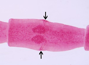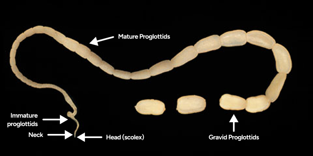 The posterior proglottids at the end of the tail are filled with egg packets.