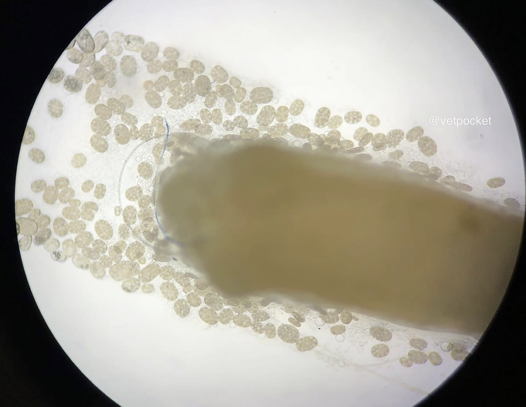 These egg-filled posterior proglottids (also called gravid proglottids) detach and migrate to the perianal region of the dog or cat, or pass in the dog or cat’s feces and into the environment.