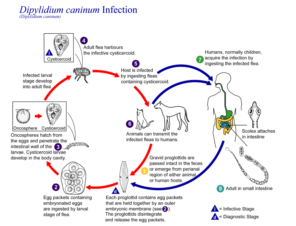 These ingested eggs then release their oncospheres (tapeworm embryos) in the dog or cat flea’s (or dog louse’s) intestine which then develop into cysticercoids as the dog or cat flea (or dog louse) larva matures into an adult dog or cat flea (or adult dog louse).